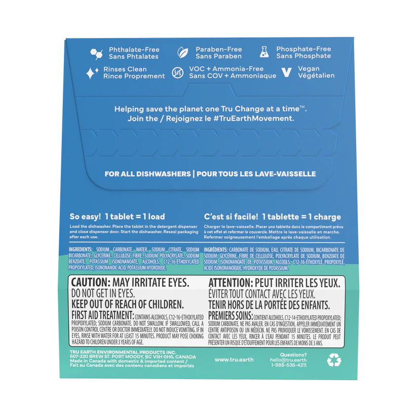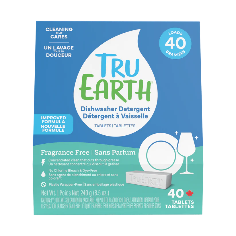 Tru Earth Dishwasher Detergent Tablet is our new and improved formula that is powerful and easy to use.  It comes in a plastic container-free recyclable cardboard pouch.